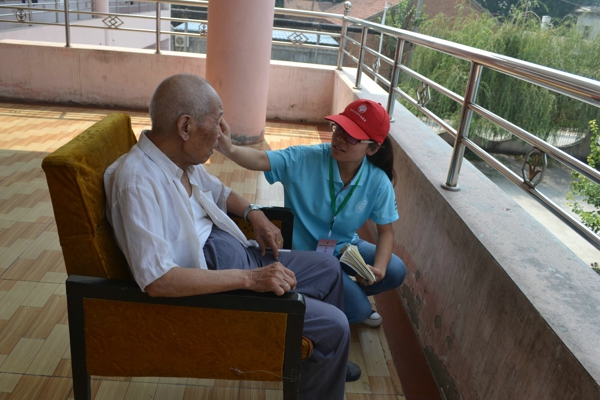 志愿者悉心倾听老奶奶讲述她的经历及政府对老人的照顾
