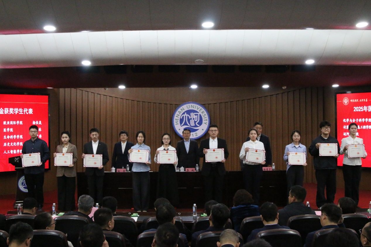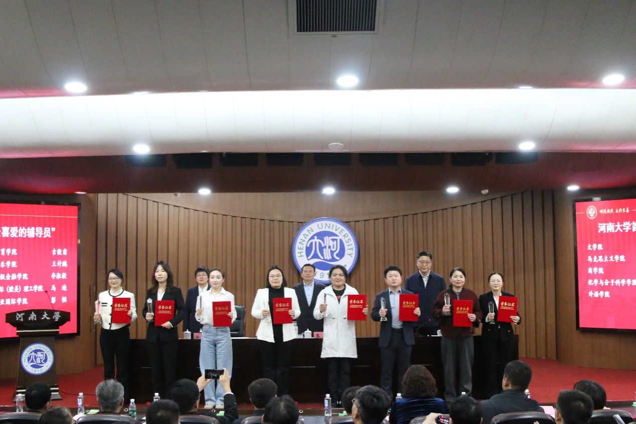 近日,学校在金明校区行政楼249会议室召开学生工作会议,表彰2025年度学生工作先进集体和个人。我院荣获资助育人先进集体荣誉,党办主任、2022级本科辅导员宁攀荣获河南大学首届“我最喜欢的辅导员”荣誉称号,2023级本科生金瑜作为国家奖学金获奖代表登台领奖。