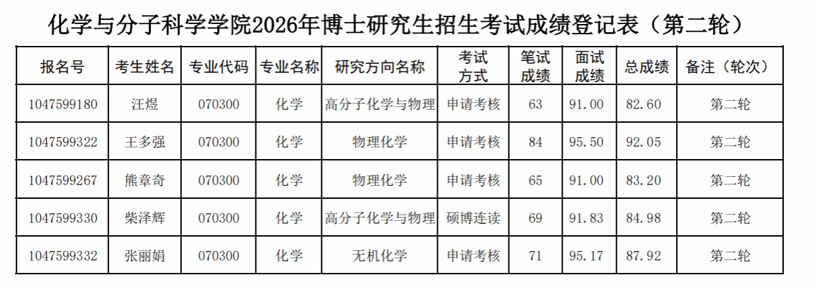 化学与分子科学学院2026年博士研究生招生考试成绩登记表(第二轮)